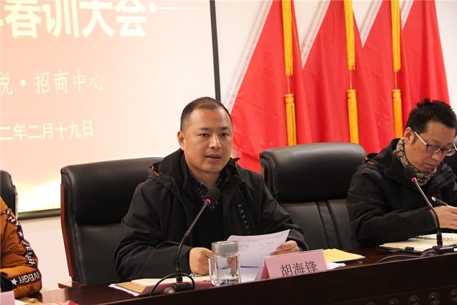為總結回顧2021年工作成效,謀劃和布局2022年各項工作,明確目標,細化措施,2月19日,招商中心、金信財稅2022春訓大會在中心駐地順利舉行。公司全體員工60人參加會議,招商中心主任、金信財稅總經理胡海鋒主持會議。